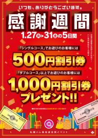 期間中、「シングルコース」でお遊びいただいたお客様には「500円割引券」、「ダブルコース」以上でお遊びいただいたお客様には「1,000円割引券」をプレゼント致します!